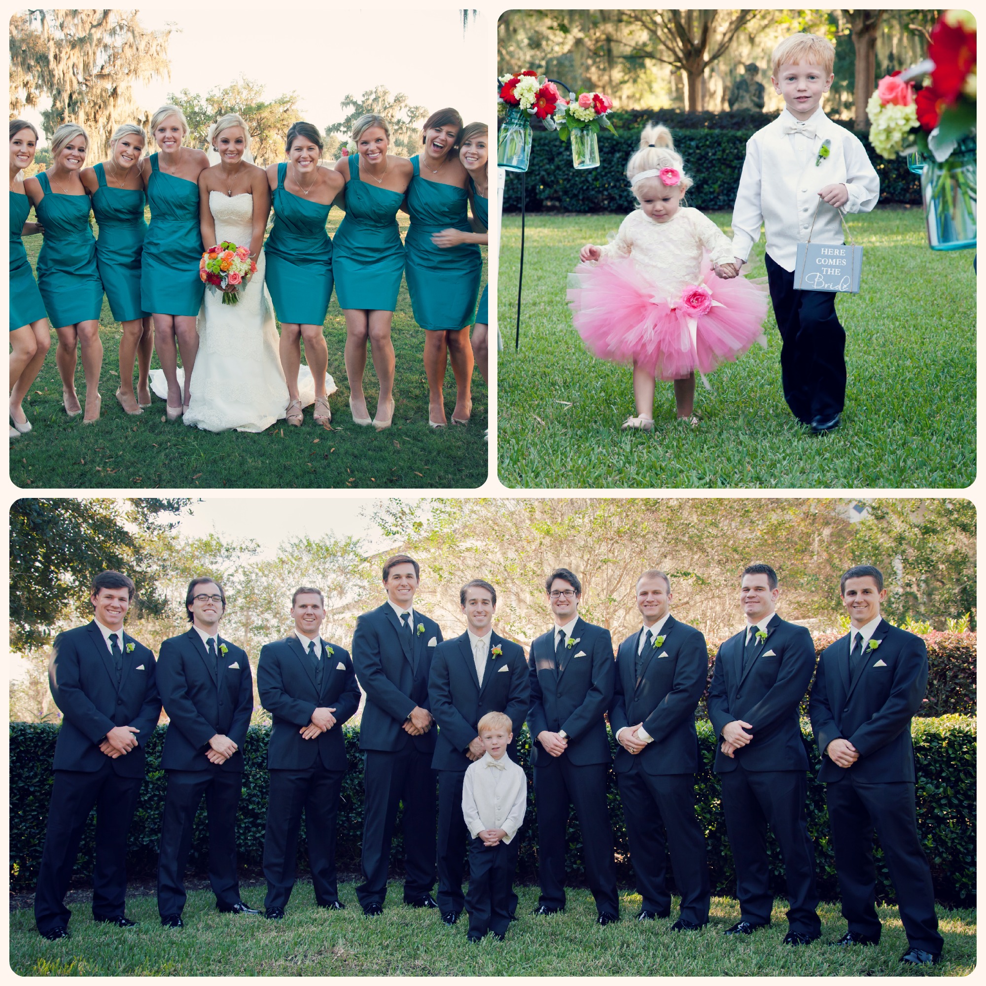 Should be simple, right? Bride wears white, groom wears black, and the bridal party sports traditional tuxes and stiff dresses that will end up at Goodwill or on Ebay at the mercy of some tasteless soul who deems it a hopeful fixer-upper. Seriously – there are significantly more awful bridesmaids dresses on the market than wearable – as if designers are inspired by the notion that the bride will somehow look better if the bridesmaids look pitiful. We all know someone like that… That aside – Remember when I said selecting the venue determines the path of the planning? Date plays a role as well. I had envisioned groomsmen in dapper, creamy suits sans jacket – an alternative to men in black. And I wanted the bridesmaids in coral or Tiffany blue. Oops, I wanted summer colors for a fall wedding. Wedding rules trump Pinspired ideas. So, at the end of the day, the fellas ended up in black tuxedos – but my smokin’ husband rocked an ivory vest and tie (snuck that creamy ivory in after all) and the lovely bridesmaids wore silk taffeta in teal from J. Crew (fall’s version of aqua).