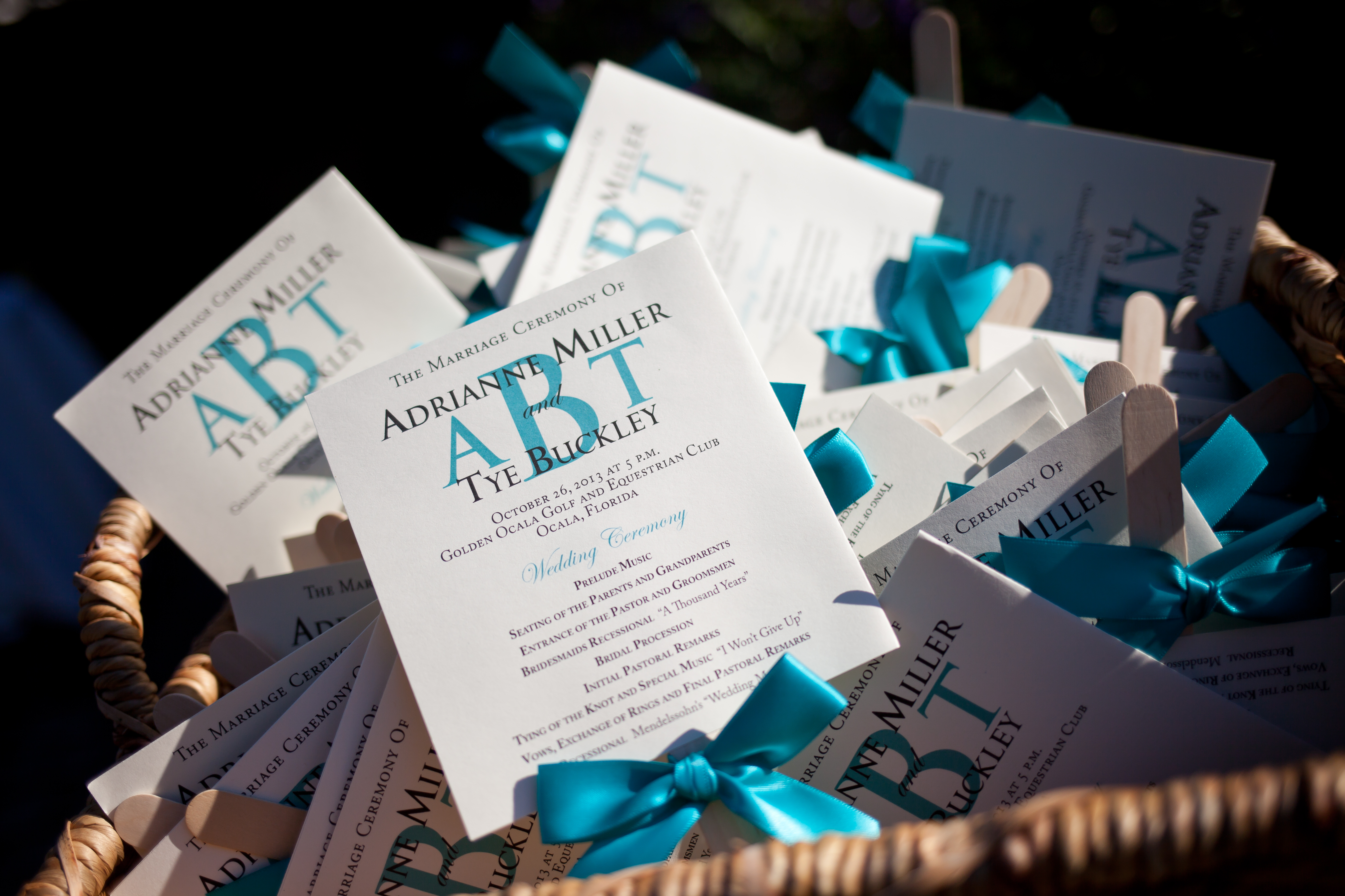 • Monogrammed wedding program fans: I had the audacity to get married outside in Florida, a foolhardy move to tempt the weather-gods to elicit either extreme heat, a spontaneous monsoon, mosquito laden humidity – or in our case, a rare “fall” day with a crisp, cool breeze and clear blue skies (I started praying over a year in advance… God loves me best). Nevertheless, we were prepared – with sassy fans.